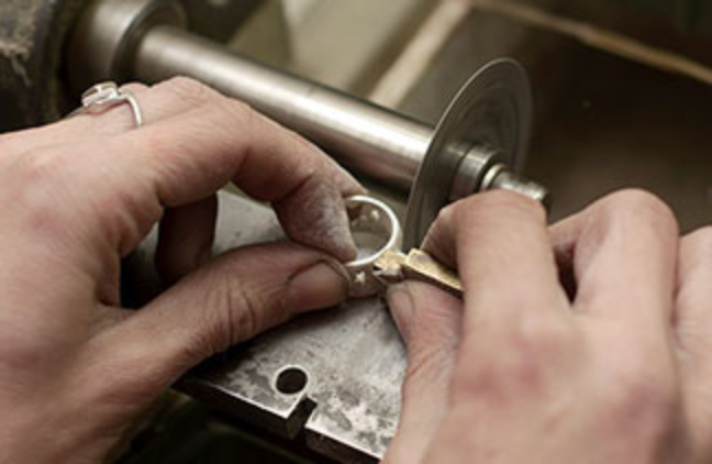 After casting and cooling the various precious metal parts are cleaned and assembled and receive a first series of cleaning and polishing to prepare the ring to be set with the precious stones.