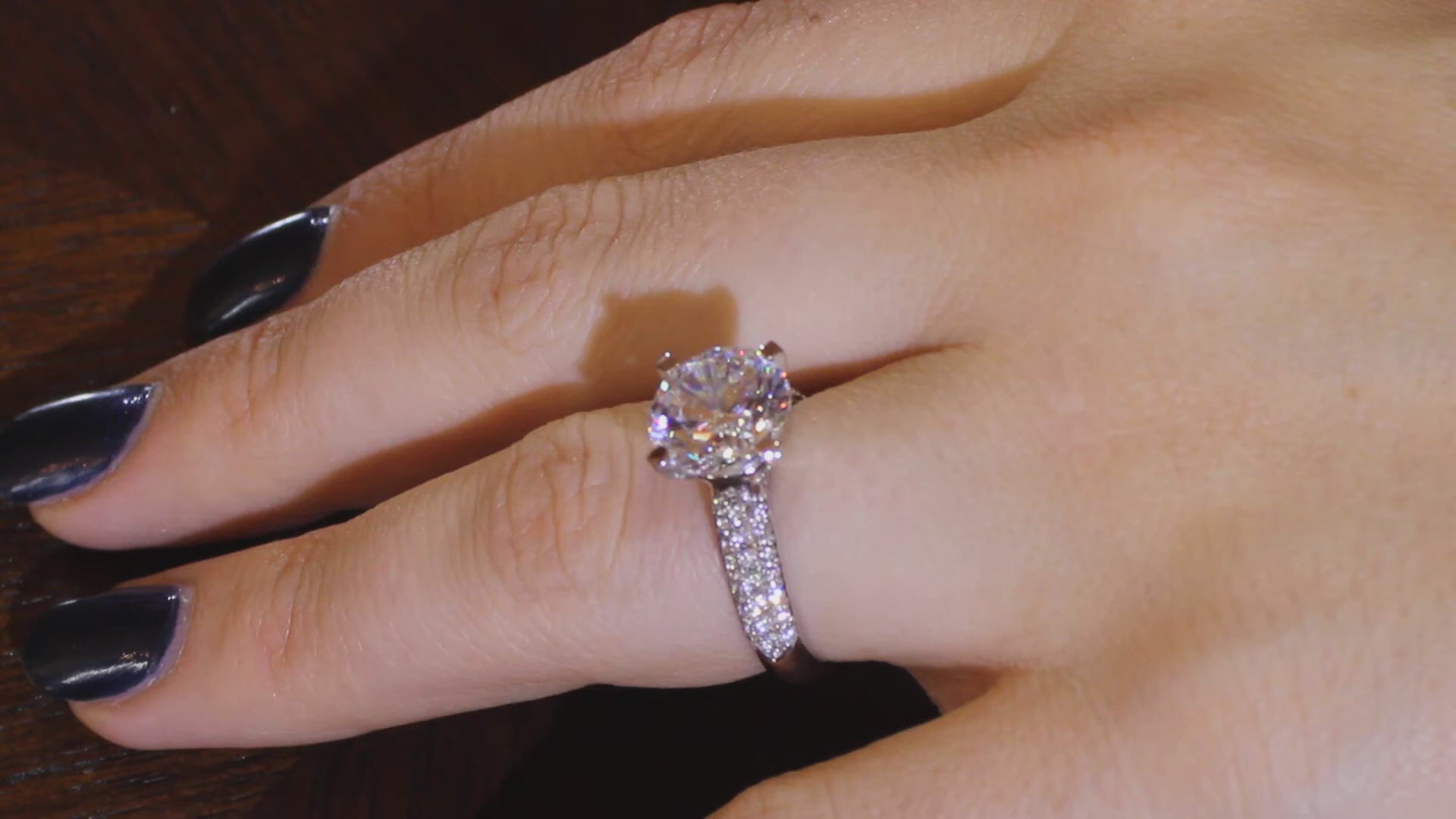 A bespoke diamond ring named “Kathleen” is a gorgeous ring. This is a bespoke handmade ring. Majestically mounted in a platinum four-claw setting with micro melee diamond features on the crown. This wonderful ring also features a sumptuous micro pave encrusted diamond shank and has a matching wedding band to match. A truly beautiful ring.