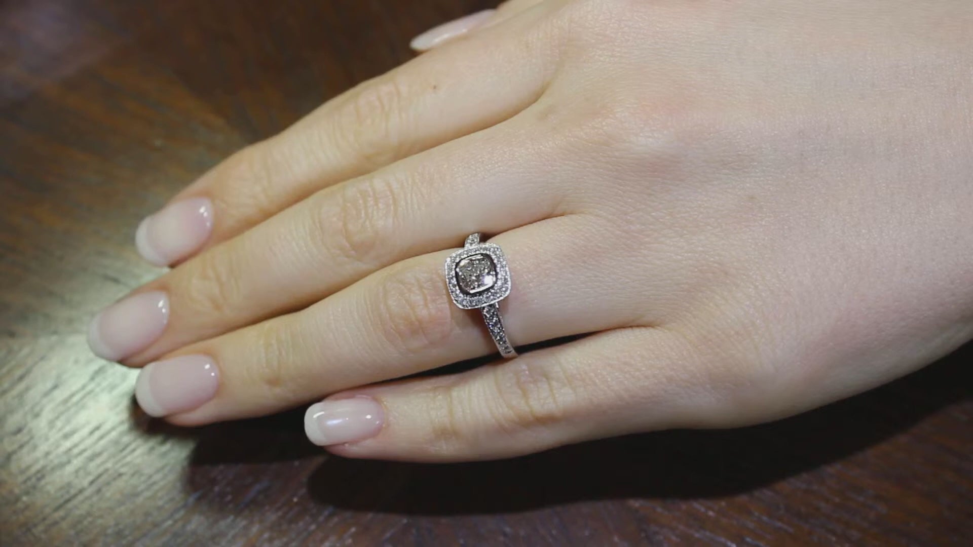 The Bezel Set Cushion Ring pictured has a GIA CERTIFIED .50CT cushion shape E COLOUR with SI1 CLARITY diamond centre. The halo has a weight of .40ct giving a combined carat weight is .90ct.