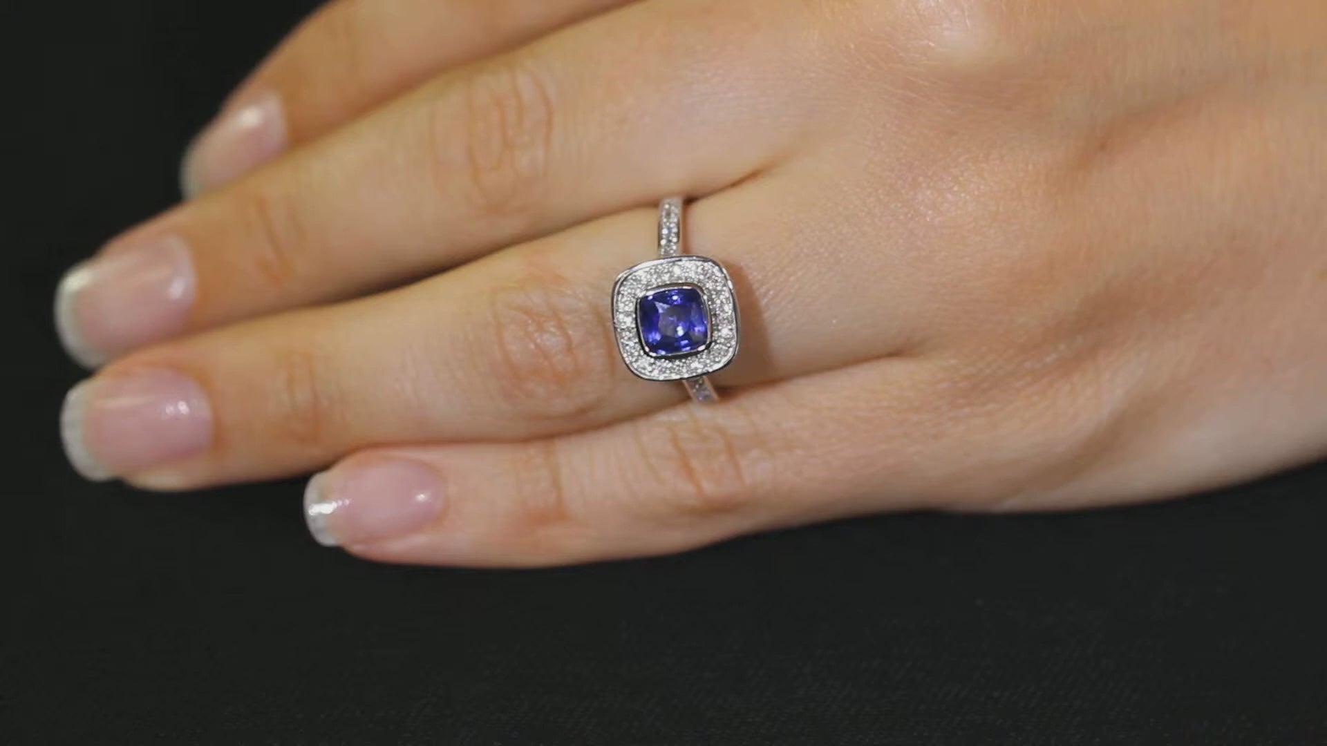 Cushion Cut Sapphire Engagement Ring 'Elle Sapphire'. Set in a wonderful rub-over setting with an antique style halo bezel of 20 round brilliant cut pavé set diamonds. This beautiful ring also has half eternity pavé set of glistening diamonds on the shoulders/band. This sapphire engagement ring is available with a selection of plain/patterned and matching diamond wedding bands and is available in white gold, platinum, yellow gold, and rose gold.