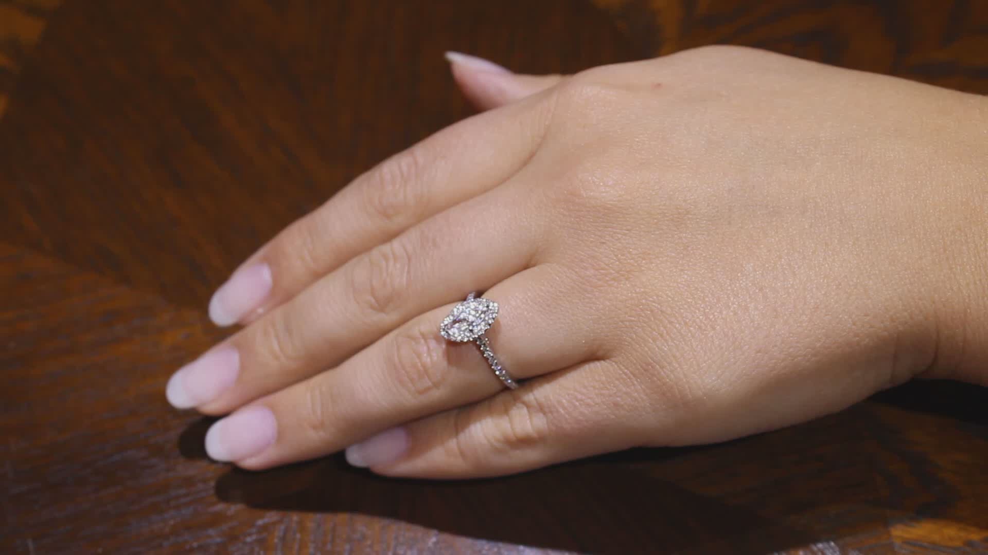 The Marquise halo engagement ring pictured has a .71ct E Vs2 certified by GIA. The diamonds on the halo and band are .30ct. The total carat weight is 1.01ct.