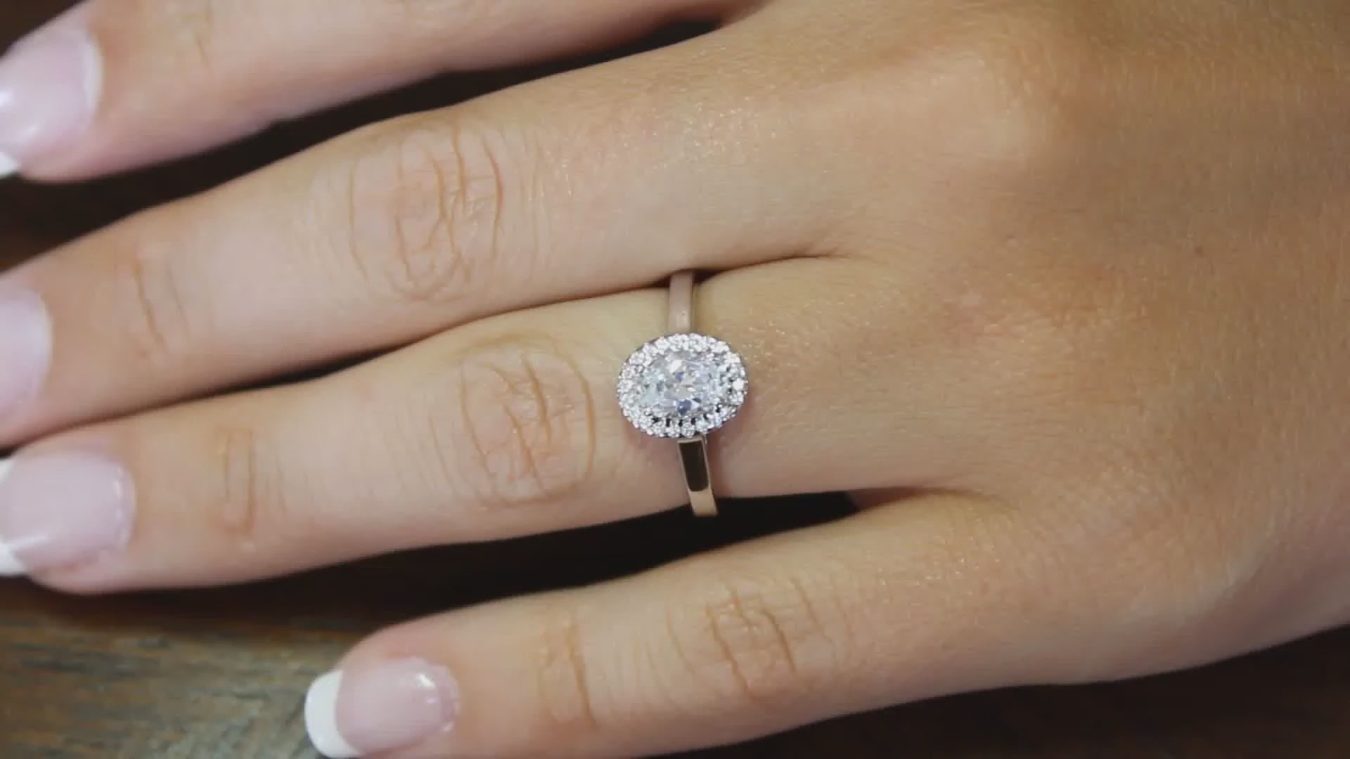 Oval Cut Diamond Vintage Engagement Ring named “Lynn”. An oval-cut diamond is majestically in the centre. 22 complementing scallop set round brilliant diamonds to make up the halo. The simplicity of the classic setting of an Oval Diamond in a halo is exquisite. This beautiful engagement ring is available in white gold, platinum, yellow gold, and rose gold and is available with a selection of plain/patterned and matching diamond wedding bands.