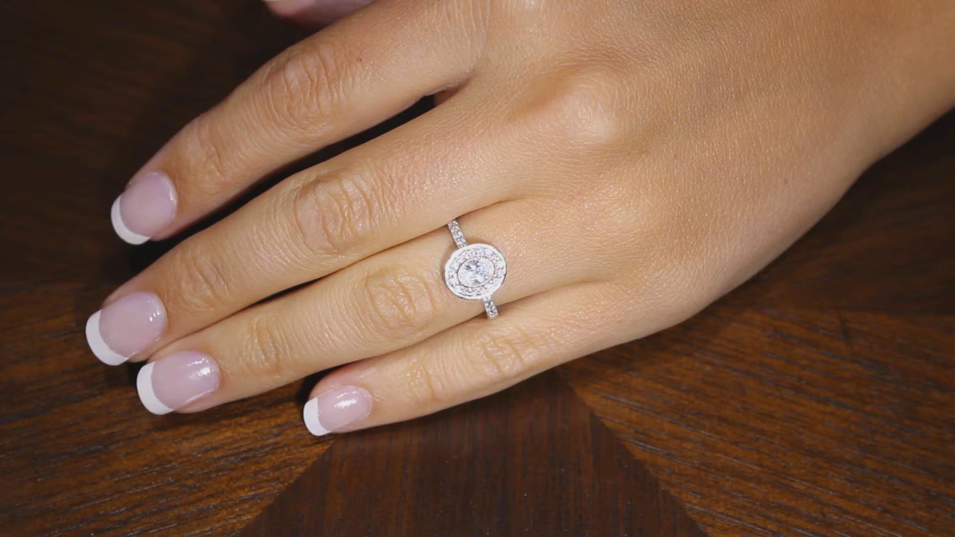 The Milgrain Detail Engagement Ring pictured has a .50ct D VS1 oval cut diamond certified by GIA. The halo and the band have .50ct of diamonds giving a total carat weight of 1ct.