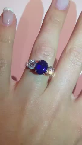 Oval Cut Sapphire and Diamond Trilogy Engagement Ring named ‘Lucy’. A gorgeous sapphire & diamond trilogy ring. The ovals are in a shared four-claw setting. A graduated look to add width and maximize beauty. This engagement ring is available in white gold, platinum, yellow gold, or rose gold and is available with a selection of plain/patterned and matching diamond wedding rings. The Royal Blue Sapphire is among the most sought-after sapphire colours. It also commands some of the highest prices.