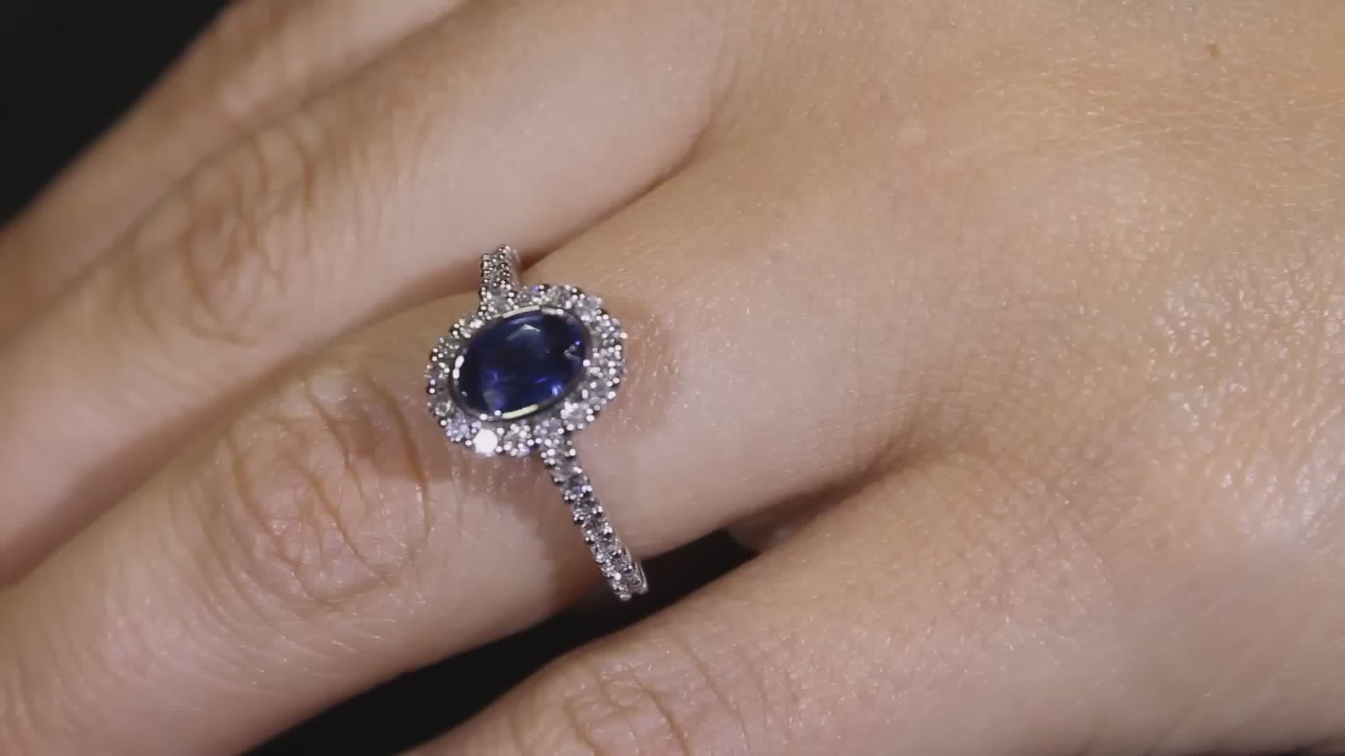 Sapphire Bezel Engagement Ring – ‘Marilyn Sapphire’. A glistening halo of white diamonds showcases the navy blue sapphire in spectacular fashion. The ring is wed-fit which means a wedding ring sits perfectly beside it. The Sapphire Bezel Engagement Ring is also available in platinum, rose, or yellow gold. The pictured ring has a .80ct sapphire in the center and the ring has .40ct of white diamonds.