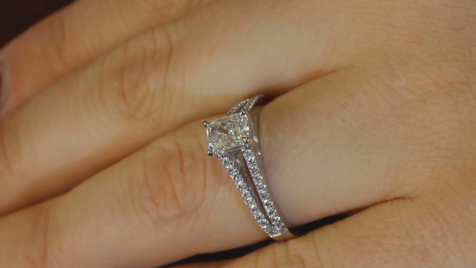 - Spectacular sparkle with a scallop-set round brilliant diamond split band