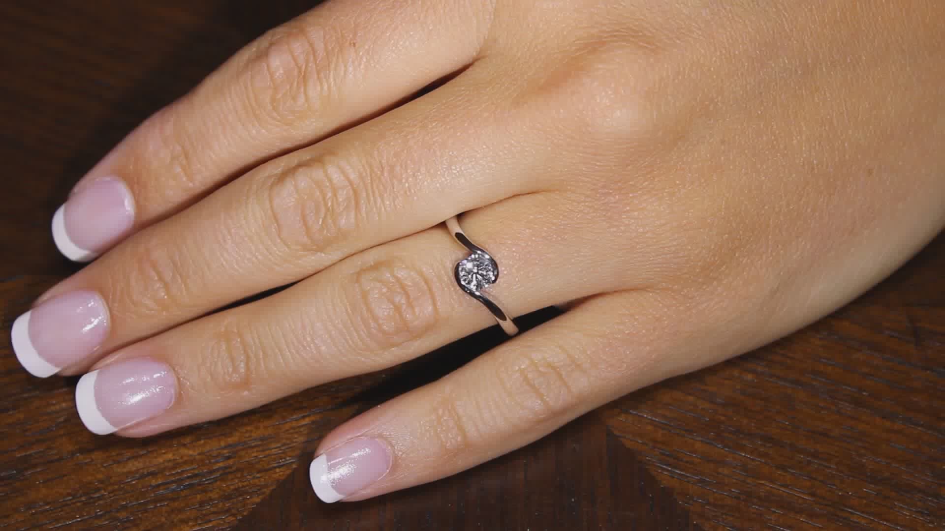 Round Cut Diamond Engagement Ring with Platinum Tension Set named ‘Sofia’. A wonderfully feminine tension-set diamond ring. Displayed with a round brilliant cut diamond with a tension twist setting. Beautifully, unusually and different.