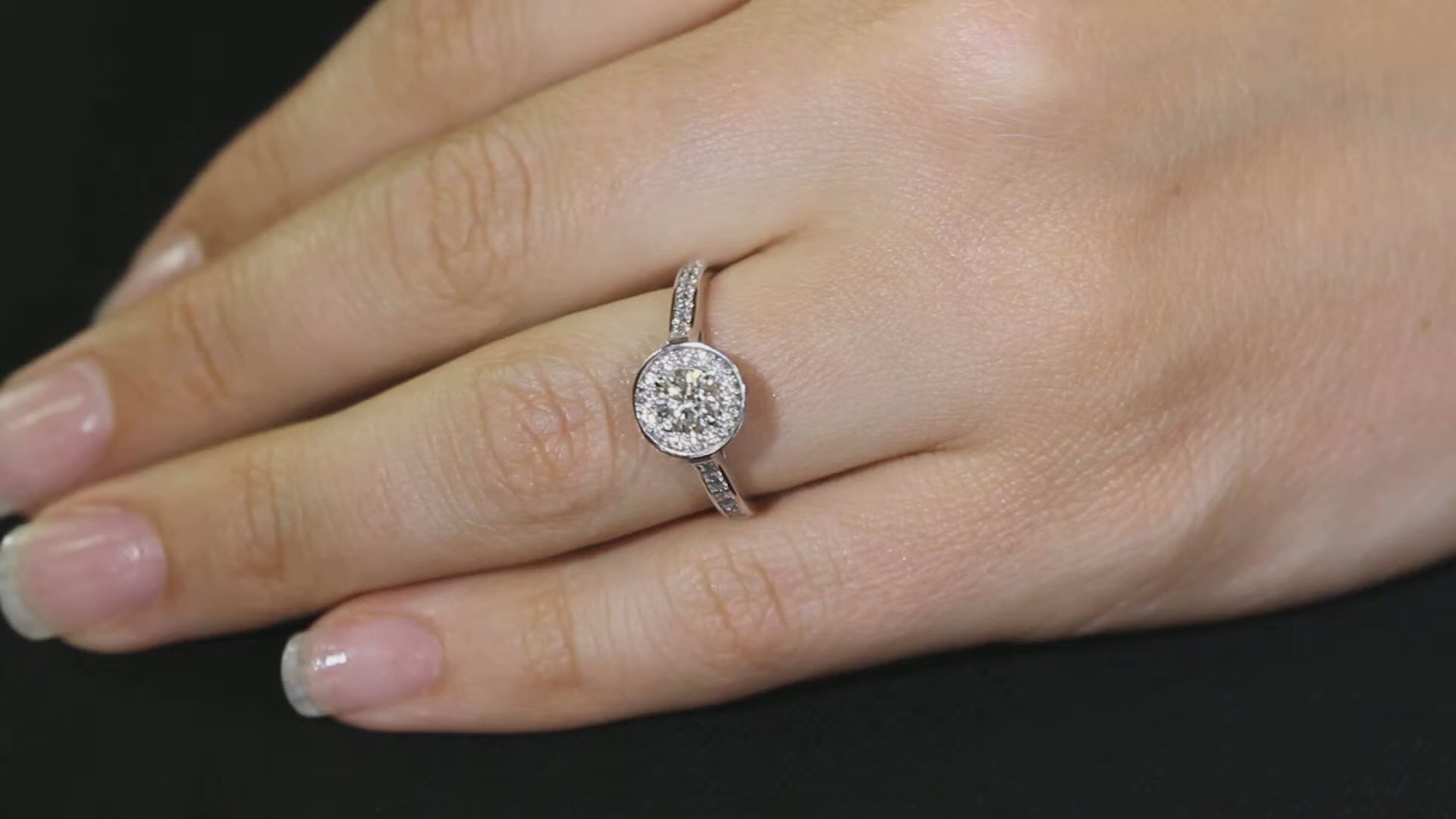 Round halo engagement ring named “Rose”. Featuring a round brilliant cut diamond attractively mounted in an antique-style halo. 14 twinkling round brilliant cut pavé set diamonds to make up the halo. This fantastic ring also has pavé set diamonds on the shoulders/band. Round Halo Engagement Ring can be made to suit any budget and in any precious metal, you require. The ring pictured has a .50ct F Colour SI1 Clarity round brilliant cut diamond certified by HRD. For the halo diamonds and diamond shoulders the total carat weight is .80ct.