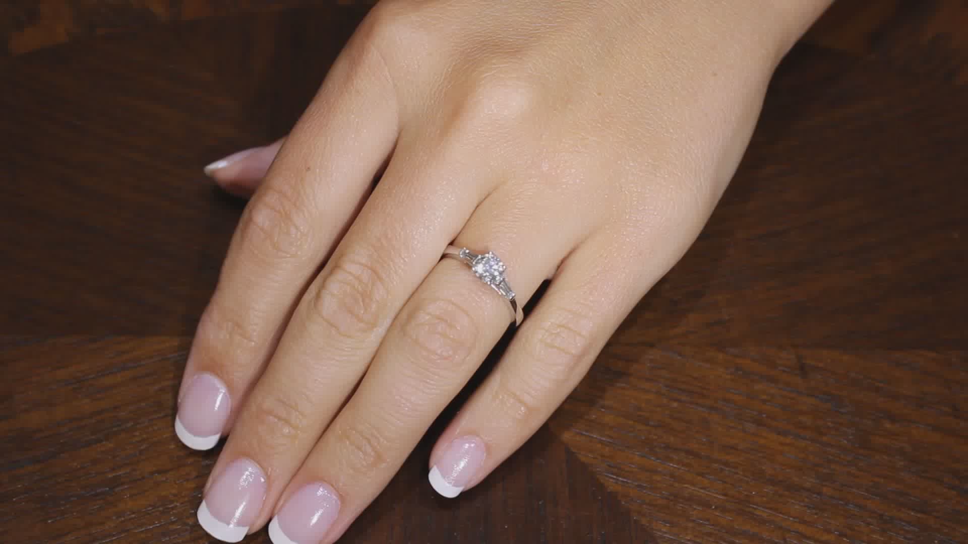 The ring pictured has a centre stone that is a .55ct F VS2 round brilliant cut diamond certified by GIA. The total carat weight is .80ct.