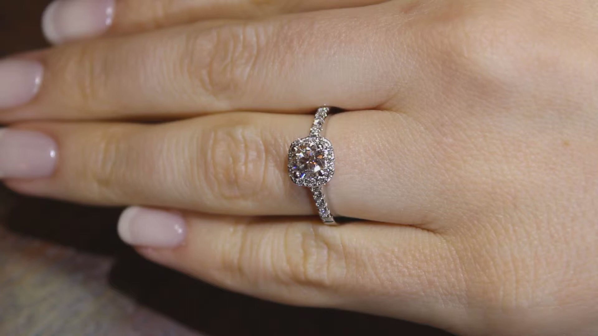 Round Cut Halo Diamond Engagement Ring named ‘Harriot’ has a stunning round brilliant centre stone. A beautiful halo containing 18 round brilliant diamonds surrounds the centre stone. 9 round brilliant scallop set diamonds adorn the fabulous shoulders of the ring. This style is much sought after and is a much-desired diamond ring. The ring pictured has a centre stone of 1.05ct E SI1 certified by GIA. The halo and shoulder melee stones are .36ct. The total carat weight of this ring is 1.41ct.