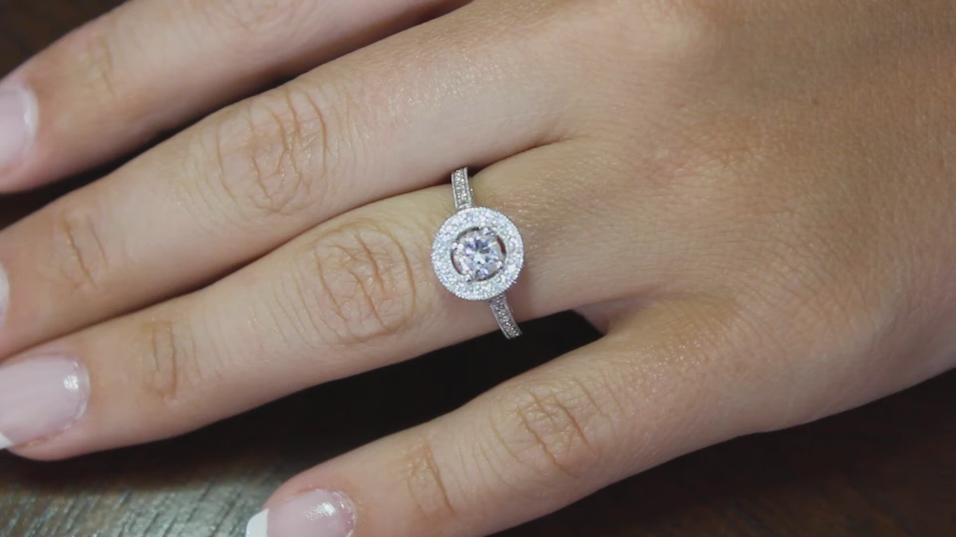 The Vintage Style Ring pictured has a .80ct G VS2 round brilliant cut diamond certified by HRD. The diamonds on the halo and band are .30ct giving a total carat weight of 1.10 carat.