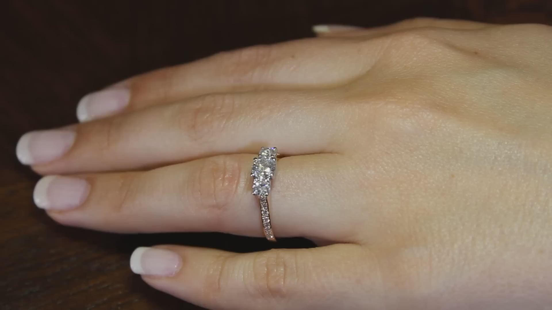 Three Stone Round Cut and Round Diamond Engagement Ring with slightly smaller round brilliant cut diamonds set on either side of centre stone. This ring also features scallop set diamonds on the shank. Available in white gold, platinum, yellow gold or rose gold. It also has a selection of plain/patterned and matching diamond wedding rings.