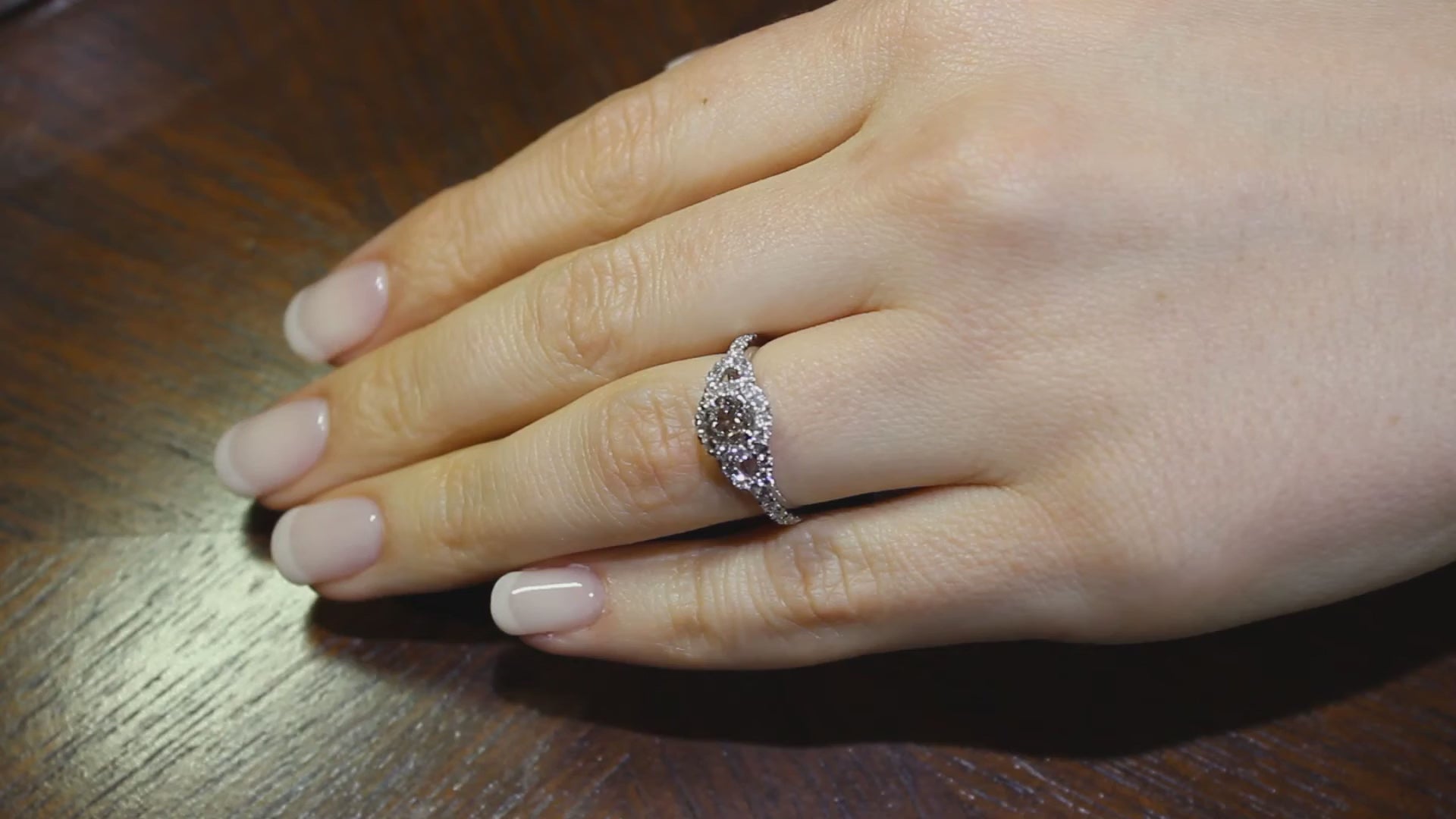 The three-halo antique ring pictured has a .40ct F COLOUR VS2 CLARITY round brilliant cut diamond certified by GIA. The two side stones are .30ct each and the melee on halo is .10ct. The total carat weight is 1.10ct.